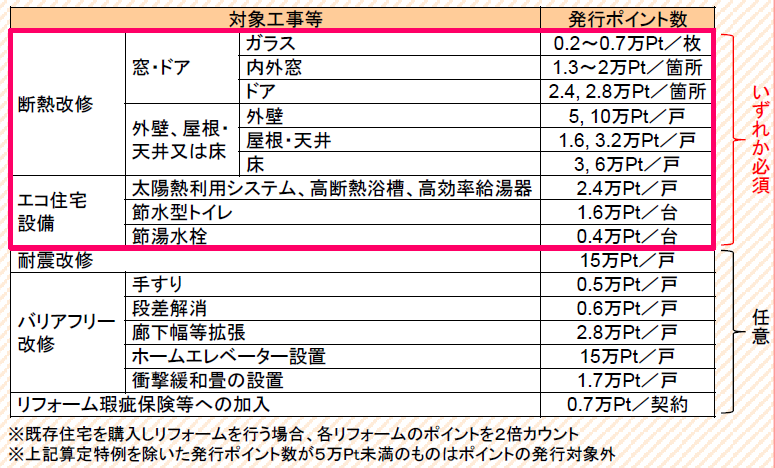 工事部位ごとに決められたポイント(0.2~15万ポイント)が設定され、該当するごとに加算される仕組みとなっています。上限は1戸当たり30万ポイントまでとなっており、加算したポイントの合計が5万ポイント未満の場合は制度の対象外です。