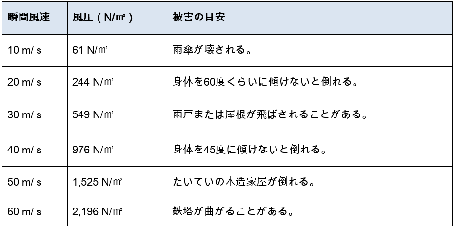 瞬間風速(m/s)との関係は以下の通りです。